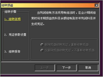 系統(tǒng)提供向?qū)浇Y(jié)轉(zhuǎn)方式。結(jié)轉(zhuǎn)損益前,當(dāng)前期間所有憑證必須全部記賬完。結(jié)轉(zhuǎn)損益后,當(dāng)前期間涉及有損益科目的憑證不能刪除;必須先刪除損益結(jié)轉(zhuǎn)才可。