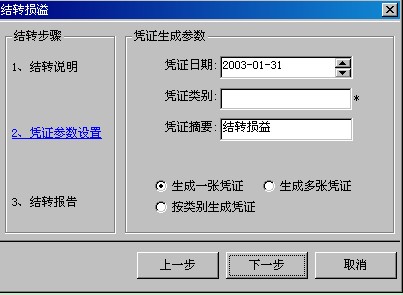 2、 憑證參數(shù)設(shè)置:憑證參數(shù)設(shè)置界面如圖3-3所示,在如圖3-3所示的界面上錄入憑證日期(系統(tǒng)默認(rèn)值為當(dāng)前期間的最后一天,用戶可以維護)、憑證字(系統(tǒng)默認(rèn)值為記,用戶可以維護)、憑證摘要(系統(tǒng)默認(rèn)值為結(jié)轉(zhuǎn)損益,用戶可以維護)、生成憑證張數(shù)定義,單擊下一步按扭系統(tǒng)給出損益結(jié)轉(zhuǎn)結(jié)果提示;單擊上一步則回到結(jié)轉(zhuǎn)說明界面如圖3-2所示。