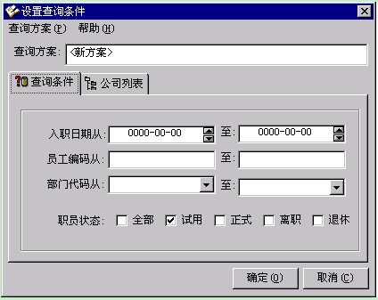 對試用合格的員工辦理轉(zhuǎn)正手續(xù)在此進(jìn)行。需辦理轉(zhuǎn)正的員工的資料來源是:員工檔案中員工狀態(tài)為“試用”的員工。選取人事動態(tài)模塊點擊菜單“員工轉(zhuǎn)正登記”,其查詢界面如圖4-1。確定或取消后其界面則如圖4-5所示。其功能如下: