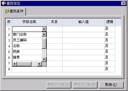4、點擊菜單“查找”,其所示界面如圖4-4所示。查詢條件有:入職日期、員工編碼、部門代碼、員工狀態(tài)。輸入查找條件,系統(tǒng)會一一給出符合設(shè)定條件的結(jié)果。