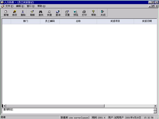 此模塊用來記錄員工受獎受懲的信息。選取人事變動模塊中“員工獎懲登記”菜單。其查詢界面如圖4-8。點(diǎn)擊確定或取消按扭后,其界面如圖4-19。操作功能如下: