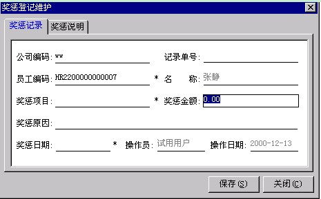新增: 新增界面如圖4-20。員工代碼、獎懲項(xiàng)目、獎懲原因有資料可選。