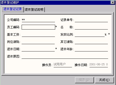 新增: 新增界面如圖4-22。員工代碼、退休原因有資料可選。還可錄入