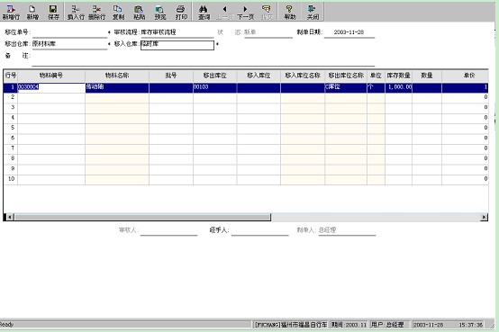 1. 修改:選擇一新單,然后點(diǎn)擊工具欄中的 或者菜單[文件\修改],進(jìn)入移位單修改界面(同錄入界面,各字段的含義與錄入時(shí)一樣),修改相關(guān)的資料后保存,修改完成。