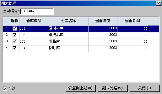 1. 在期末處理窗口中選中要恢復到上期的倉庫后點擊<恢復到上期>.