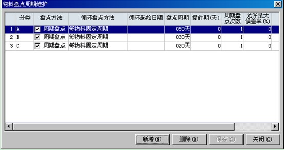 輸,有兩個選項。若選擇實物盤點,則該記錄的‘盤點周期’和‘盤點提示期’不可用,用該類物料在生成周期盤點計劃是不考慮。 |