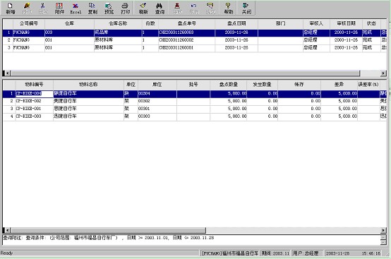 6. 點(diǎn)擊菜單[檔案\儲存]或工具欄中的‘儲存’,‘盤點(diǎn)單號’欄會自動生成一個編號,盤點(diǎn)表已保存成功。對盤點(diǎn)表中的每一條記錄,會產(chǎn)生對應(yīng)的盤點(diǎn)卡號.