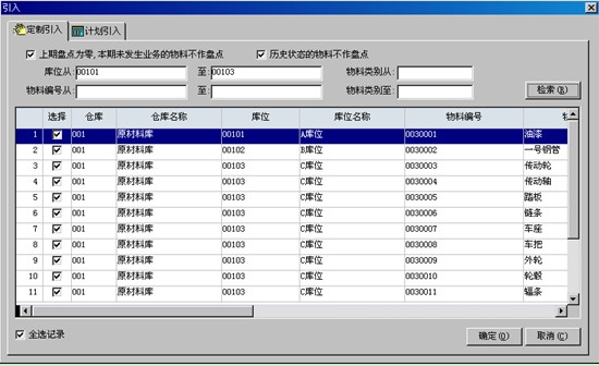 b.引入窗口默認(rèn)為定制引入,如圖,錄入物料、庫位、物料類別的范圍,并設(shè)置好參數(shù),然后點(diǎn)查詢,系統(tǒng)自動根據(jù)參數(shù),顯示出指定范圍內(nèi)的物料,把不要盤點(diǎn)的物料記錄的前面的勾去掉后,按確定。盤點(diǎn)表主界面就已經(jīng)顯示了引入時打上了勾的物料。