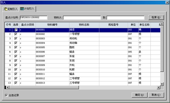 c.如果選擇計(jì)劃引入,則界面如圖,選擇盤點(diǎn)計(jì)劃,錄入物料范圍后,點(diǎn)檢索,系統(tǒng)自動顯示出盤點(diǎn)計(jì)劃中本倉庫的在指定范圍內(nèi)的物料記錄。把不要盤點(diǎn)的物料記錄的前面的勾去掉后,按確定。盤點(diǎn)表主界面就已經(jīng)顯示了引入時打上了勾的物料。