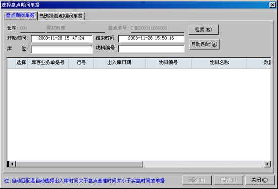 2. 選擇盤點期間單據(jù):點擊菜單[文件\選擇盤點期間單據(jù)]或工具欄的 ,系統(tǒng)彈出下圖的窗口,窗口中列出了盤點表中的物料在盤點基準(zhǔn)日期至今的所有出庫、入庫單,在相應(yīng)的單據(jù)前打上勾后按保存。