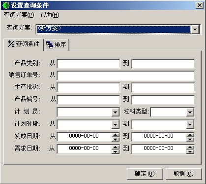 查詢方式有三種:定位、自定義查詢、查詢。查詢的查詢條件中列有:產(chǎn)品類別范圍、財務(wù)類別范圍、產(chǎn)品編號范圍、成組碼、物料類型、計劃員、查詢輔項、計劃時段。系統(tǒng)默認(rèn)的查詢條件是當(dāng)前日期之前的所有產(chǎn)品編號范圍的所有計劃結(jié)果。您能對接口上的條件進(jìn)行任意組合。查詢接口見下圖對于自定義的查詢條件具體設(shè)定請參見《公共操作手冊》。
