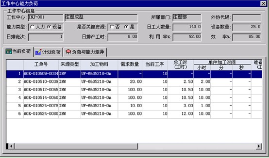 5、 點(diǎn)擊“能力” 按鈕,彈出工作中心能力負(fù)荷視窗,如下圖3-19-5-1所示.。通過該視窗可以了解當(dāng)前工作中心能力負(fù)荷的資訊、包括當(dāng)前負(fù)荷,計(jì)劃負(fù)荷和負(fù)荷與能力差異等詳細(xì)信