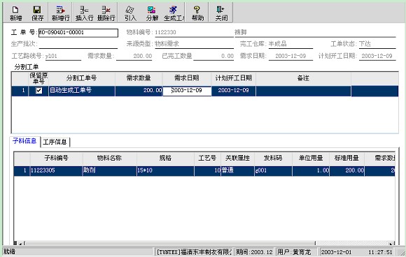 分割成功的工單除保留一個(gè)原工單號(hào)和領(lǐng)料單號(hào)外,會(huì)生產(chǎn)新的工單號(hào)以及領(lǐng)料單號(hào)。