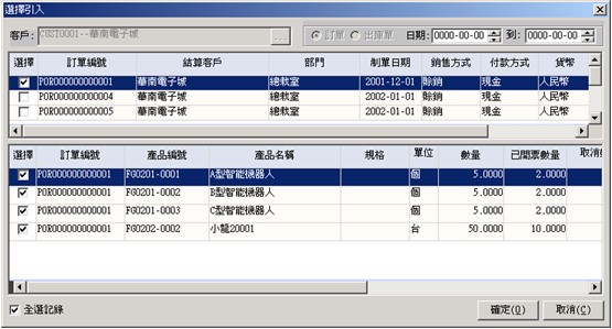 動(dòng)輸資料中的運(yùn)輸方式系統(tǒng)默認(rèn)值為送貨,用戶可以維護(hù)。其它相關(guān)資料用戶可錄可不錄。 |