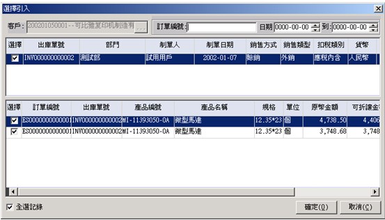 3. 如果折讓類型為普通折讓﹐則顯示如下圖的引入窗口﹐可以按銷售訂單過濾出出庫單﹐選定要進(jìn)行折讓的出庫單及產(chǎn)品記錄﹐按確定﹐所選記錄會(huì)引入到折讓單錄入主接口來。
