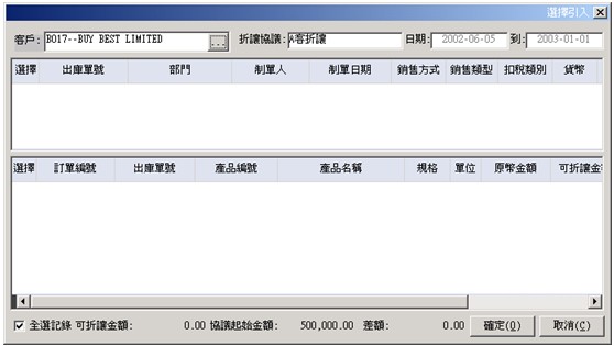 4. 如是所選的是累積折讓﹐點(diǎn)引入后系統(tǒng)顯示出如下引入窗口﹐可在此窗口中錄入相關(guān)的客戶﹑折讓協(xié)議﹐系統(tǒng)自動(dòng)過濾銷售出庫單。選擇要進(jìn)行折讓的出庫單和產(chǎn)品記錄﹐按確定返回錄入主接口﹐所選的產(chǎn)品記錄會(huì)出現(xiàn)在錄入主接口中。