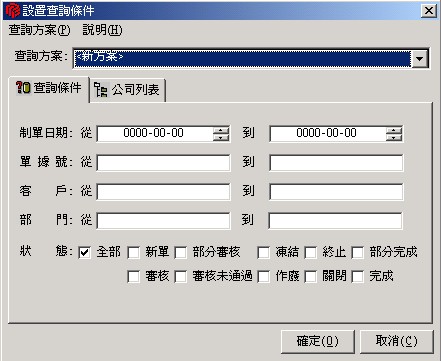 查詢方式有三種:定位、自定義查詢、查詢。查詢接口如下圖所示,接口上列有查詢條件:日期、單號﹑客戶﹑部門﹑單據(jù)狀態(tài)?蓪涌谏系臈l件進(jìn)行任意組合,具體設(shè)定請參見附錄“公共操作”。