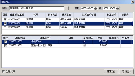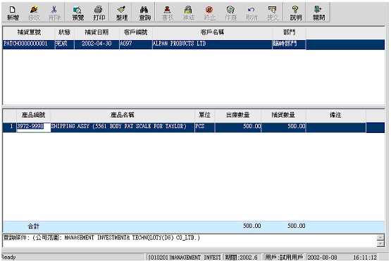 3. 在窗口中選擇客戶﹐付運通知單以及產(chǎn)品﹐按確定返回。所選的產(chǎn)品記錄會出現(xiàn)在補貨單錄入接口。你可以修改補貨數(shù)量。如圖